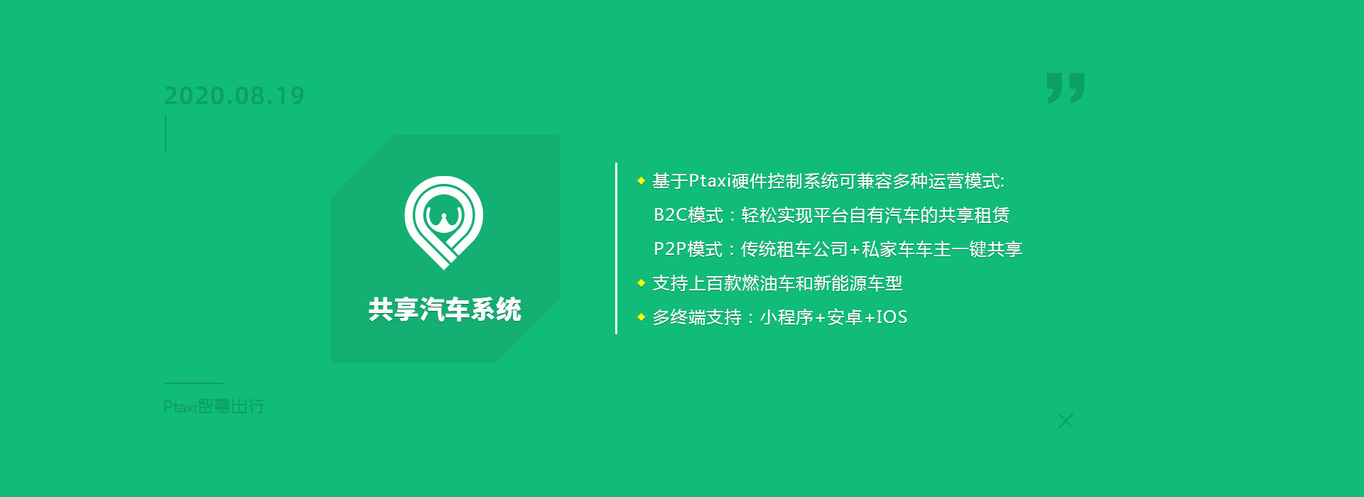 Ptaxi拥有快车、专车、顺风车、租车、代驾、出租车、跑腿、共享汽车等多项功能,可根据需求自由组合,快速定制属于自己的网约车系统支持多终端